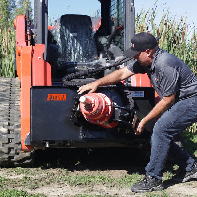 It works very simply. Use your Auger Flip Hitch and your attachments can slide on and off with great ease. Once you’re ready to attach the Cement Mixer Bowl, just rotate the Flip Hitch around so that it is at a 45-degree angle. The Cement Mixer Bowl has a 2-inch hex drive coupler at it’s base that easily attaches to the Flip Hitch. Now all you have to do is add your concrete and water and you are ready to go. The Eterra Skid Steer Auger will do the rest. The Eterra auger cement mixing system will work with all Eterra Auger Drive models.