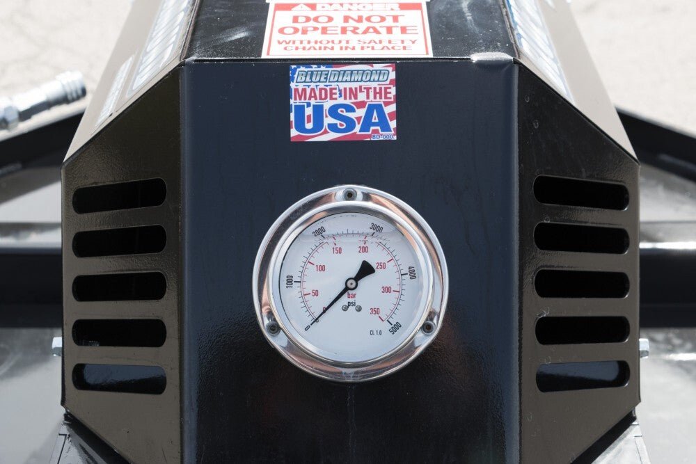 The Blue Diamond Skid Steer Severe Duty Brush Cutter delivers incredible power and versatility that will all but remove the need for a mulching head. With a 10-inch cut capacity and exceptional performance in grass, this brutally tough unit is the top in its class. Using the highest quality piston motor on the market, torque throughout its flow range is unmatched. The visible pressure gauge keeps you aware of the workload and allows you to work at peak performance, increasing productivity tremendously. The mammoth 1-inch thick blade carrier weighs over 500 lbs and features a serrated edge to help with mulching and destroying fence wire that often takes out lesser brush cutters.