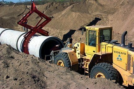 Double your production output versus the sling and chain methods with lifting clamps. The Pipe Lift's unique, wide scissor-grip design permits a secure lift - even when the pipe is not centered. The machine operator simply sets the tongs of the cement pipe clamp down over the pipe. The legs will automatically grab and hold on tightly until the pipe is set down firmly into position.