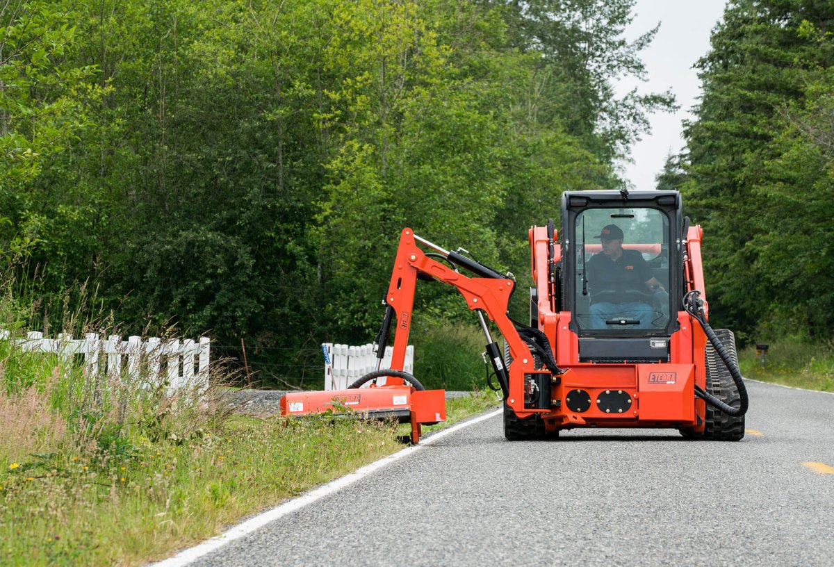 These mowers are lightweight but strong, ensuring your machine won't be tipped over while cutting. The Eterra Sidewinder is a state-of-the-art cutter designed for mini skid steers or the Raptor Boom Arm, and provides the maneuverability to clean up areas you couldn't reach before.