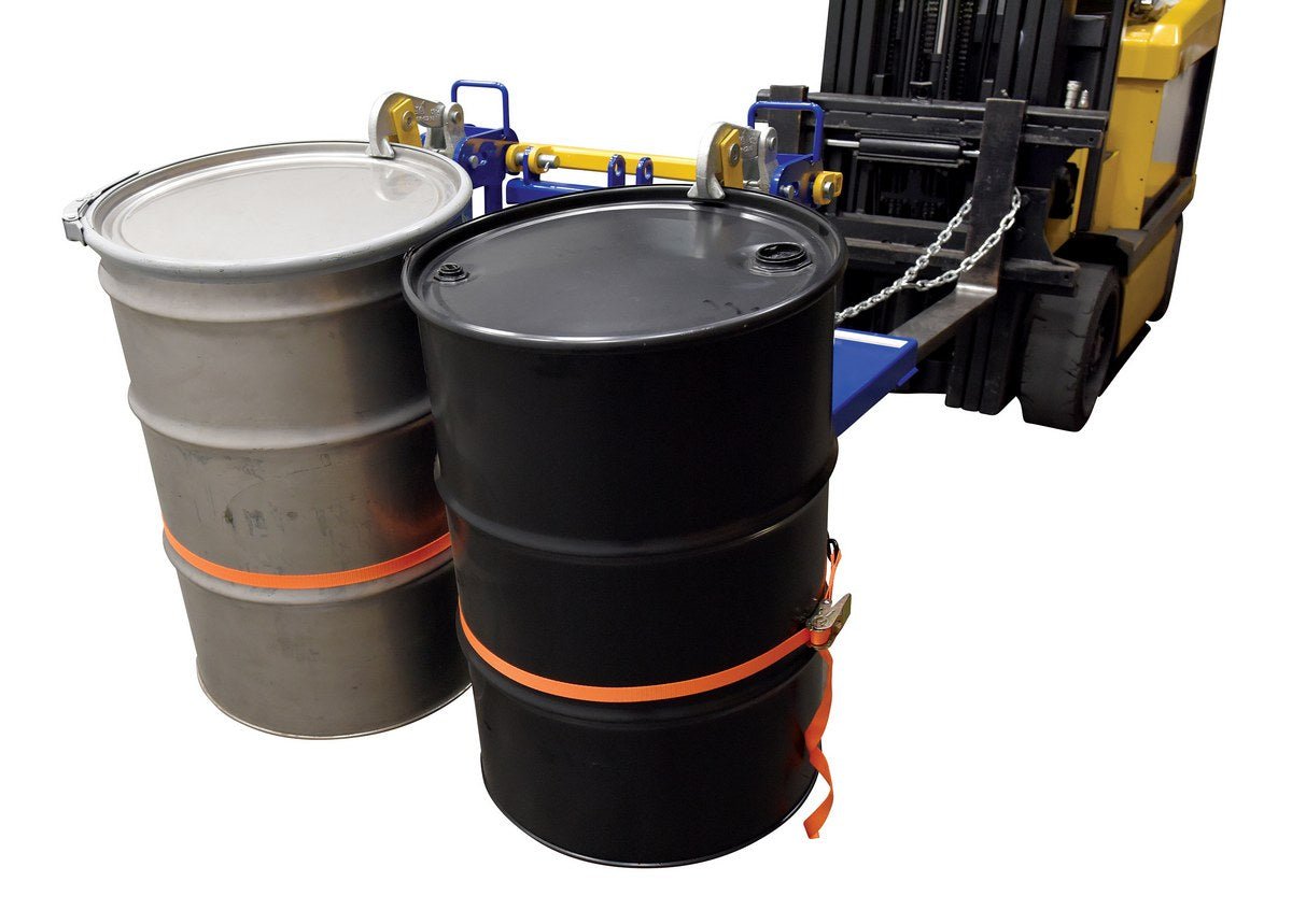 For use with open (lid installed and secured) and closed head 30 and 55-gallon plastic, steel and fiber drums with a top lip strong enough to support the weight of the drum. Choose single-drum or double-drum configuration. Includes safety restraint to secure unit to the fork truck. Welded steel construction. Powder coat finish for baked in powder-coated toughness. Fork pockets measure 7-1/2" wide x 2-1/2" high usable on 20-1/2" centers. A ratchet strap is supplied to secure the drum to the unit when traveling over rough terrain. Additonal or replacement ratchet straps available, contact factory. Meets OSHA 1910-178 requirements.